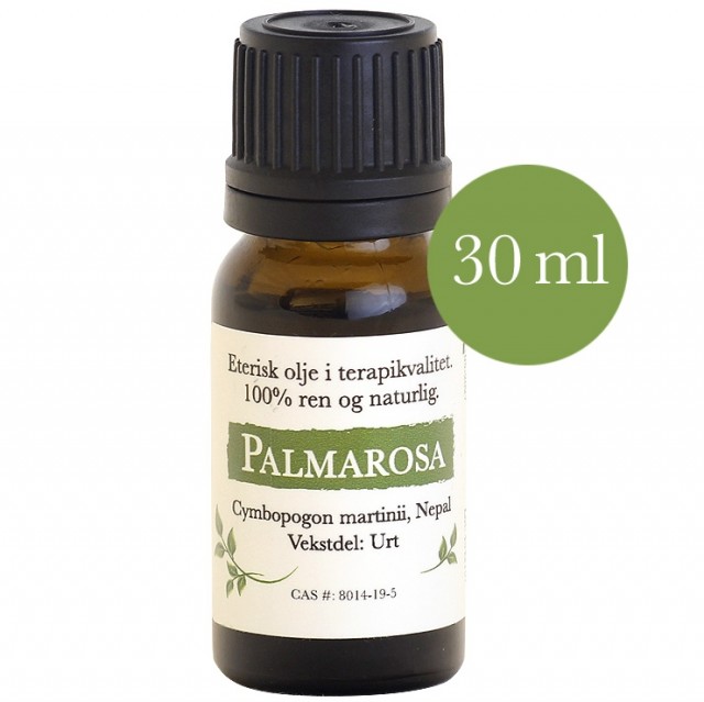 TERAPEUTISK: Palmarosa oljen er kjent for sine bakteriedrepende og antvirale egenskaper som gjør den anvendelig ved rensing av huden også ved rifter, kutt og sår. Forøvrig er den god ved all behandling av ansikt, hender og føtter. Den virker cellfornyende og har en regulerende virkning på væskebalansen i huden dvs. den er spesielt fin for tørr voksen hud og mot rynker, akner, og alle typer eksem.