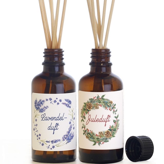 Innhold: Duftspreder med lavendelduft + 5 bambuspinner. Duftspreder med juleoljer + 5 bambuspinner.